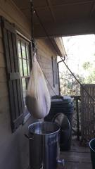 I mounted a pulley on the ceiling right over my stove so I can drain while beginning my boil. And don't be afraid to squeeze it out while draining, this is one tough bag!